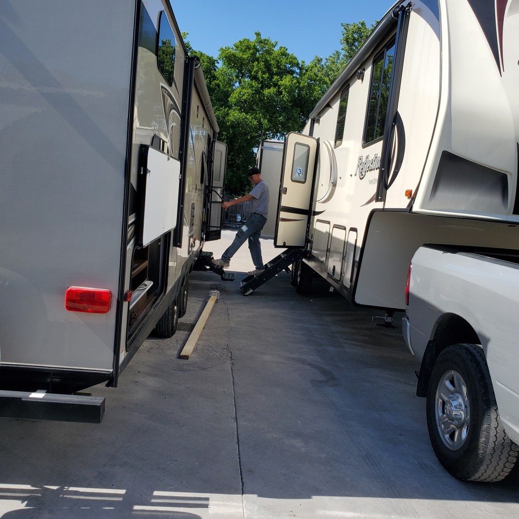 TO SMALL ALREADY! After less than 3 weeks living full time in our RV, we decided the travel trailer just was not going to work for us. The beds were too small, there was not enough storage, it felt really cramped inside for full time living. For a weekend, or an occasional week the travel trailer worked just fine, but for full time living, it just did not work for us. We made a list of desireables in a new 5th Wheel, and Laura was head strong on wanting a RV Manufactured by Grand Design. We found the perfect size and layout for us, and it was on a clearance sale as they were wanting to clear the 2020 models off the lot to make room for 2020.5 models ( mid year change ). Laura liked the colors of the 2020 over the 2020.5 anyway, we had to act fast, so we did! We purchased it on Friday, the dealer did the delivery prep, we sold the truck topper on the truck, and installed a 5 wheel hitch. We picked it up the following Monday. We were so excited to upgrade our adventure!!