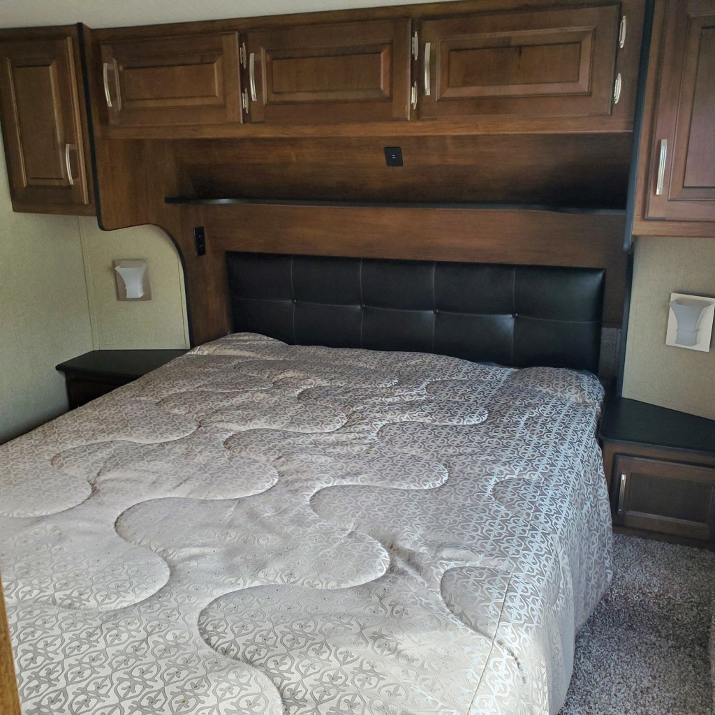 The bedroom had plenty of space all around the Full sized Queen bed for us to walk around to access the closet spaces . Although there is no slide in the bedroom, it was ok as we needed to keep the weight down, and there was plenty of space in that master bedroom.
